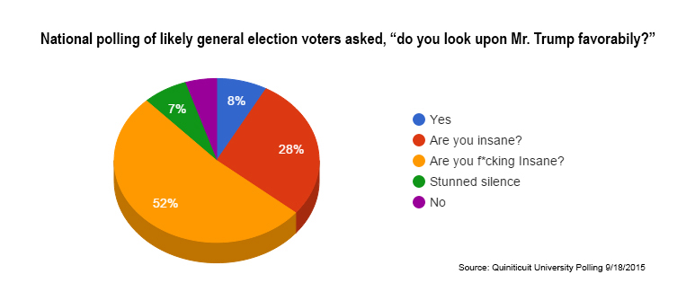 Polls of the general electorate expose Trump's real problems, as his favorability in this expanded group is dramatically different than when polling GOP primary voters. Asked if they "look upon Mr. Trump favorably", a resounding 80% responded "are you insane?" or "are you f*cking insane".